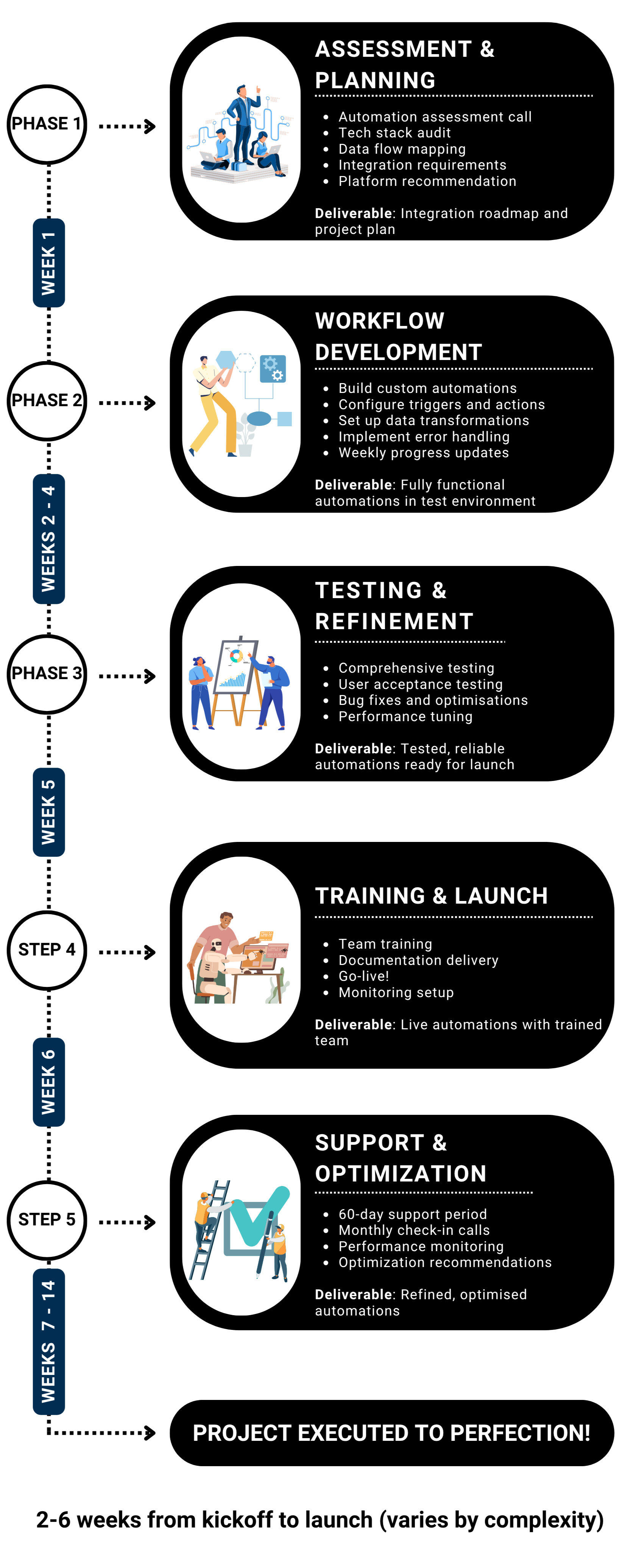 Typically 2-6 weeks depending on complexity. Simple automations (3-5 workflows) take 2-3 weeks. More complex projects take 4-6 weeks.