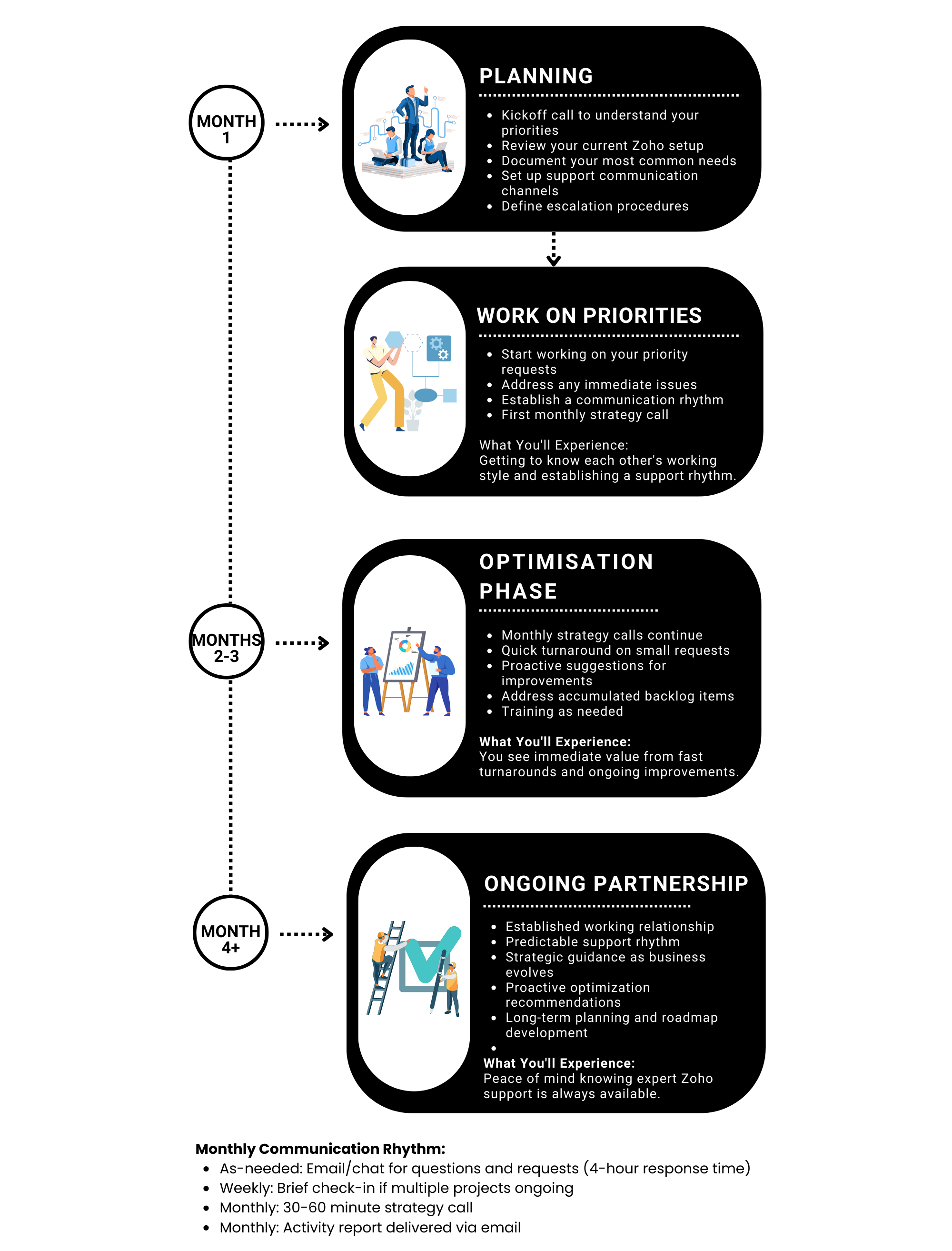 Stop paying project rates for small changes. Get predictable monthly support with priority access to Zoho expertise whenever you need it.
